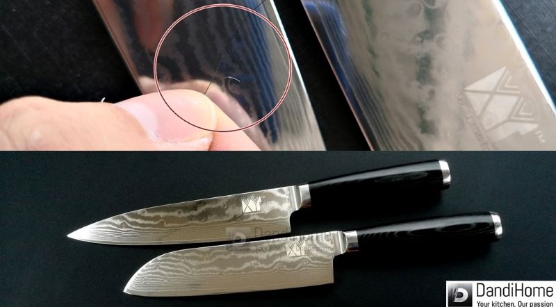<div>Trên lưỡi dao khắc logo của hãng bằng lasers và vân Damascus được tạo thành bởi rèn 67 lớp thép với nhau:</div>