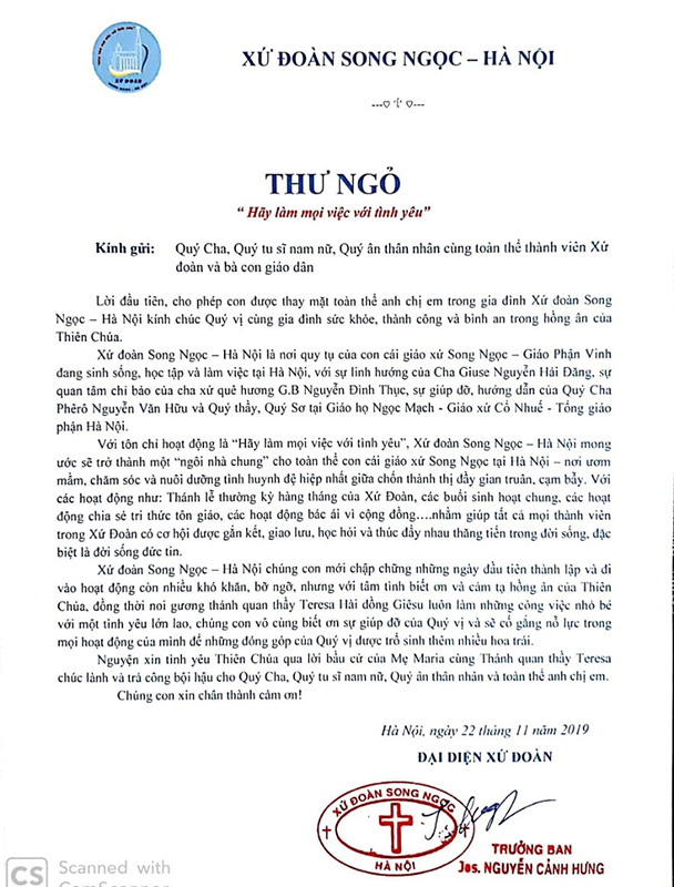 Nhờ hồng ân Chúa Thánh Thần soi sáng, qua sự linh hướng, dẫn dắt của Cha xứ và các Cha quê hương, cùng với sự quyết tâm và nỗ lực của tất cả anh em xa quê Giáo xứ Song Ngọc đang sinh sống, học tập và làm việc tại Hà Nội. Chúng con vui mừng báo tin vui: Xứ đoàn Song Ngọc - Hà Nội đã được thành lập và ra mắt vào ngày 03/11/2019 với các phương hướng và đường lối hoạt động trước mắt như sau: