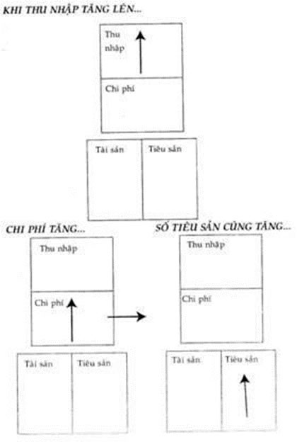 <p>Chi phí số một của hầu hết mọi người là thuế: thuế thu nhập, thuế giá trị gia tăng khi tiêu xài, mua sắm hàng hoá… Khi thu nhập tăng, chi phí tăng theo, số tiêu sản cũng sẽ tăng lên. Có thể chứng minh bằng cách quay lại ví dụ của cặp vợ chồng trẻ. Kết quả của việc thu nhập tăng lên là họ quyết định sẽ đi mua ngôi nhà trong mộng. Khi đã có nhà, họ sẽ phải trả một thứ thuế mới gọi là thuế bất động sản. Sau đó họ mua một chiếc xe mới, đồ đạc mới và những dụng cụ mới để hợp với ngôi nhà mới của mình. Rồi họ bỗng giật mình nhận ra rằng phía cột tiêu sản đầy những món nợ cầm cố và nợ tín dụng.</p>