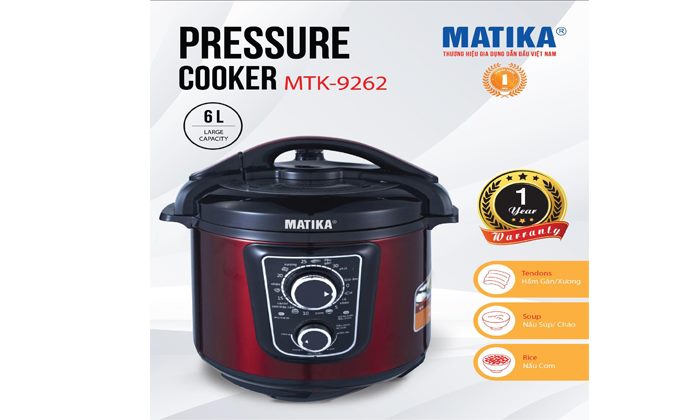 <div>Nồi áp suất Matika MTK-9262 được sản xuất theo dây chuyền công nghệ Nhật Bản, lắp ráp tại Việt Nam, là bộ sản phẩm rất phù hợp cho mọi gia đình và được rất nhiều các bà nội trợ vô cùng yêu thích. Nó có thể nấu cơm, nấu canh hay món hầm, soup,.. hiệu quả cho mọi nhà.</div>