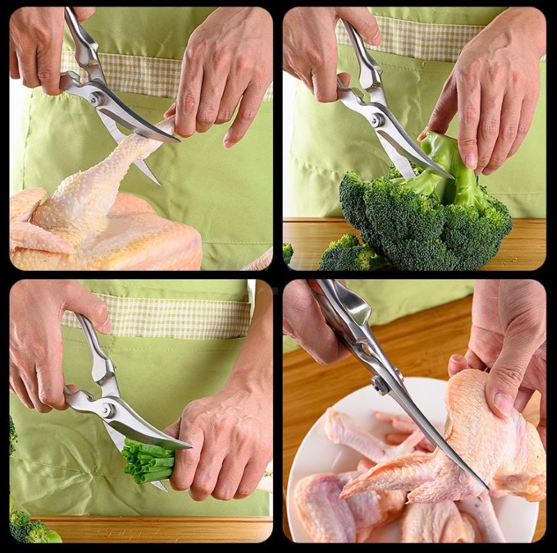<p>Chắc hẳn ai cũng đã từng loay hoay với món gà/ vịt. Để chặt gà, bạn cần chuẩn bị dao thớt, lót giấy … vì khi chặt nước bắn ra rất xa, khó tránh được bẩn sàn. Giải pháp đơn giản là sử dụng kéo cắt gà. Tuy vết cắt không đẹp bằng chặt, nhưng sử dụng kéo lại rất tiện, rất nhanh, không bị bắn như chặt.</p>