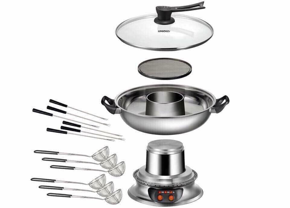 - Nồi được làm bằng thép không gỉ, vỉ nướng chống dính thiết kế đặt giữa nồi lẩu khi có nhu cầu, có thể bỏ rời nếu không có nhu cầu. Thiết kế cho 6 người ăn